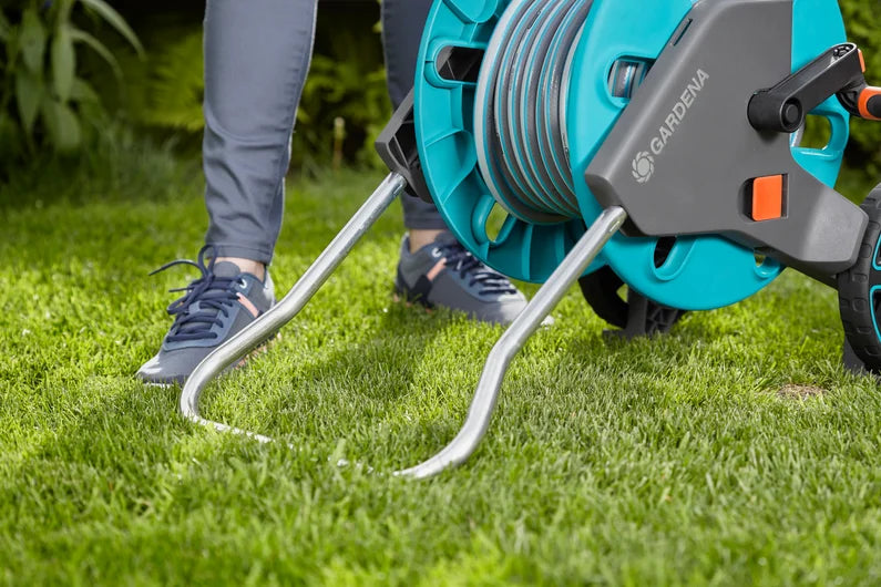 Lo speciale piede sulla base garantisce elevata stabilità del carrello. Facilita il compito anche quando il tubo viene tirato.