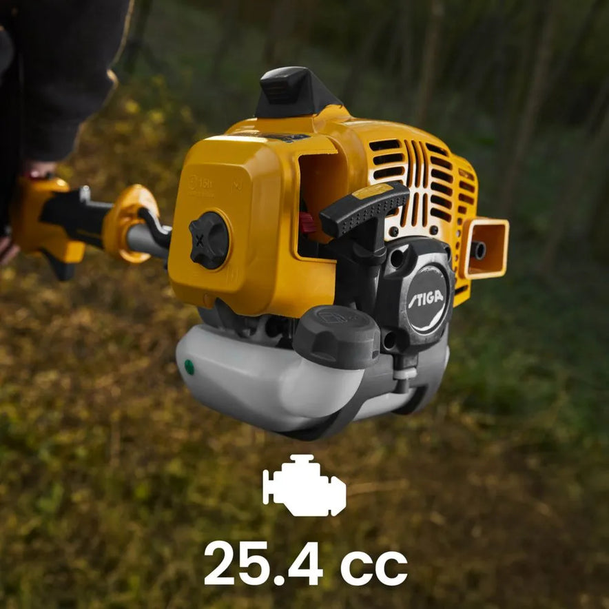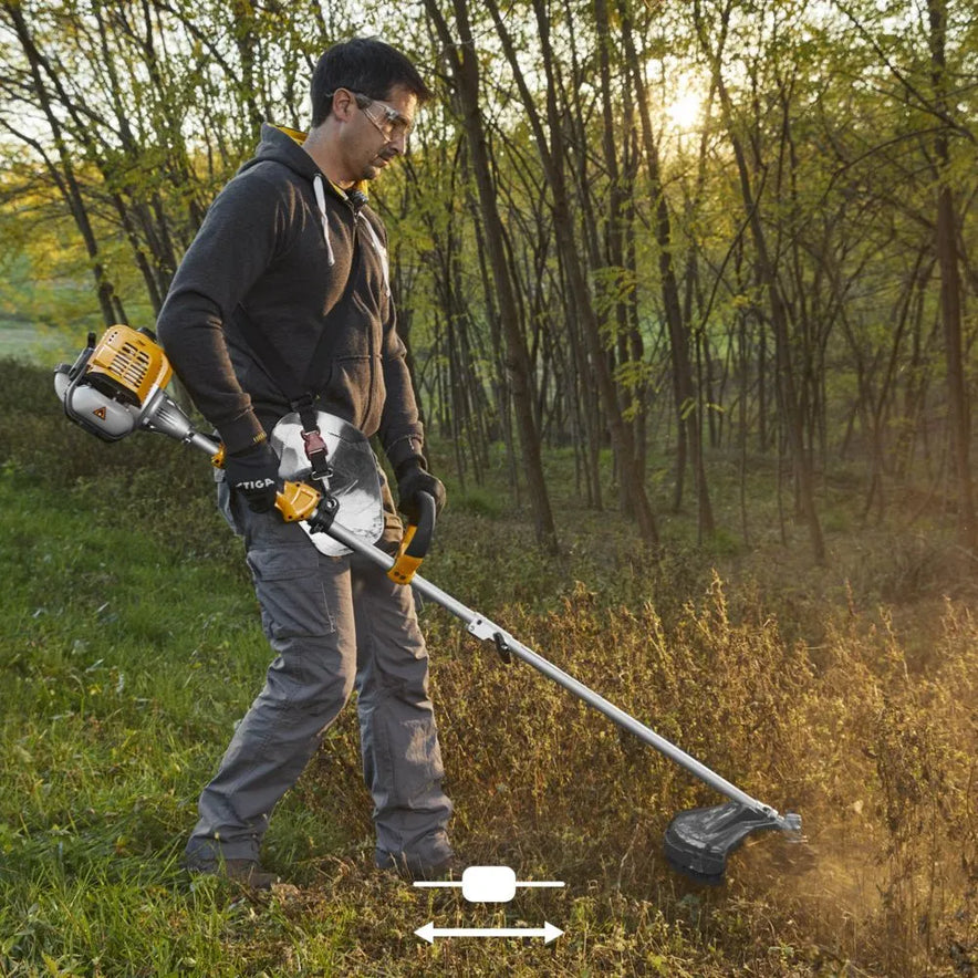 Il decespugliatore STIGA BC 330 A è alimentato da un motore a scoppio a 2 tempi da 25,4 cc e potenza di 0,7 kW ed ha un’ampiezza di taglio di 43 cm. Questo decespugliatore è equipaggiato con una trasmissione giuntabile che permette di dividere l’asta in due per facilitare le operazioni di trasporto e per ridurre lo spazio di stoccaggio. L’impugnatura singola (loop) è ergonomica e permette di utilizzare agilmente il decespugliatore a scoppio anche grazie alla bretella singola inclusa. Il decespugliatore BC 330 A ha in dotazione una testina in nylon di tipo Tap&Go (“Batti & Vai") che permette di allungare facilmente il filo con la sola pressione al suolo ed una lama a 3 punte da 255 mm, utile per il taglio di sterpaglie.