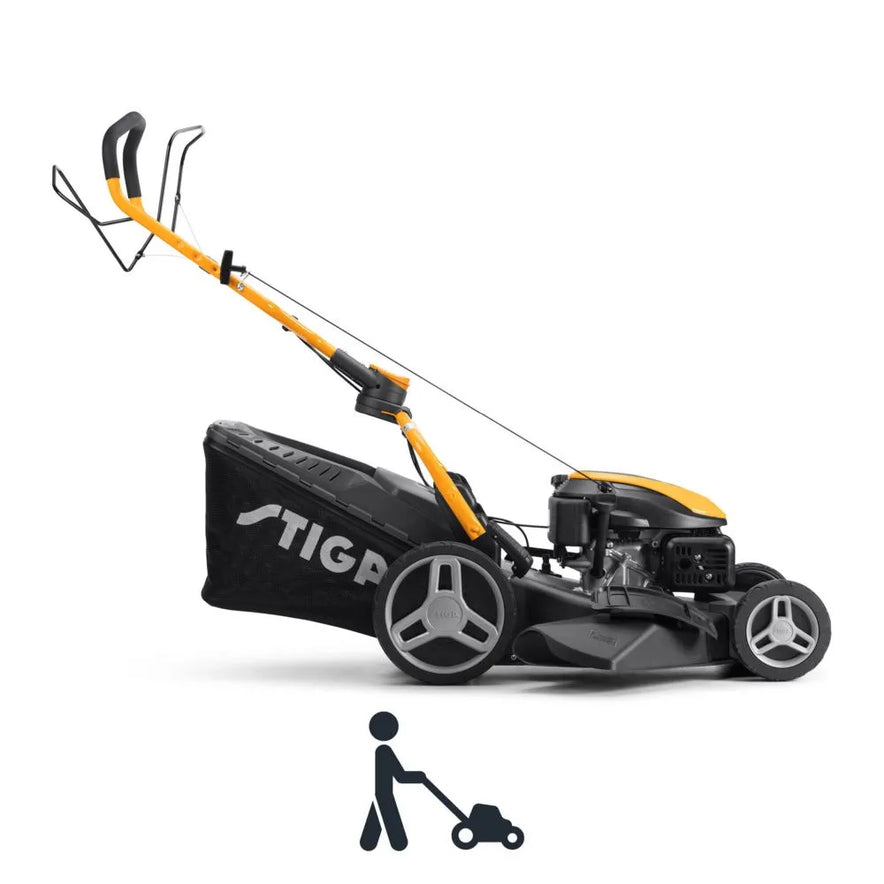 Tagliaerba a trazione con motore STIGA da 166 cc, larghezza di taglio da 51 cm e sistema di taglio 4-in-1 (raccolta, mulching, scarico laterale e scarico posteriore). Dotato di sacco di raccolta da 60 litri con indicatore di riempimento, telaio in acciaio e regolazione centralizzata dell’altezza di taglio. Ideale per giardini di medie dimensioni grazie alla buona manovrabilità e alla trazione posteriore.